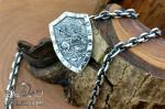 A stylish silver set featuring a shield-shaped pendant with St. George the Victorious and a men's anchor chain. The central element is a relief pendant with a detailed depiction of the victory over the dragon. The wood grain, voluminous rivets, and expressive composition create the effect of a historical artifact and emphasize the symbolism of protection and strength.