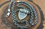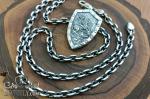 The chain is crafted in an anchor weave with facets: the links are carefully cut, enhancing the shine and adding dynamic reflections. The design ensures comfort and reliability. Blackening accentuates the shape of each element and gives the jewelry a distinctive, rugged character. The clasp is easy to use and harmoniously blends with the overall design.